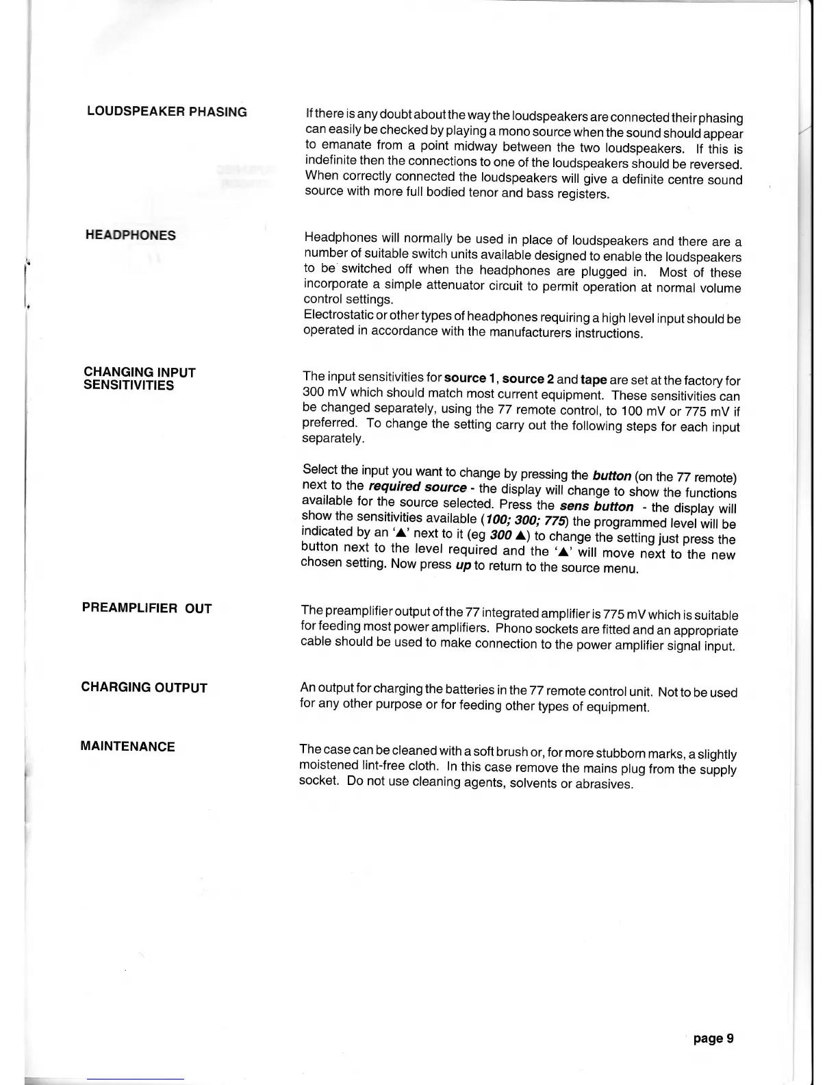 QUAD 77 - Advanced Operations and Care; Loudspeaker Phasing Check; Headphone Usage and Input Sensitivity; Output Ports and Maintenance