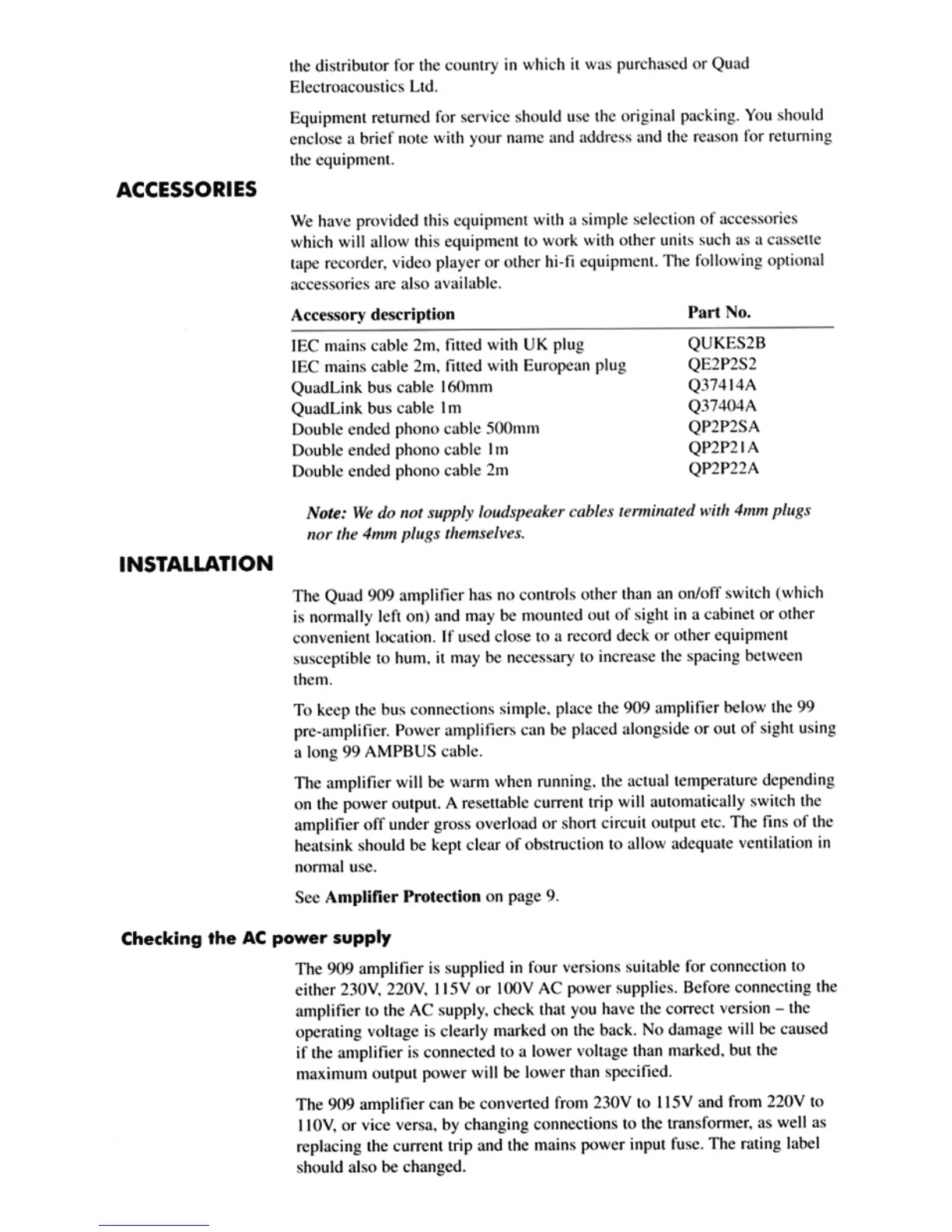 QUAD 909 - Accessories; Installation; Checking the AC Power Supply