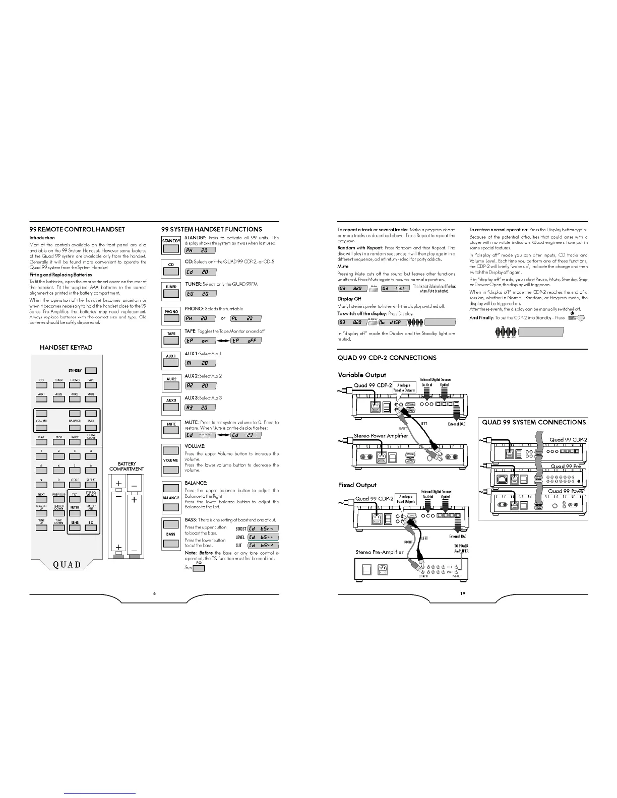 QUAD 99 PRE - Remote Control and System Connections; 99 System Remote Handset Functions; QUAD 99 CDP-2 Connections
