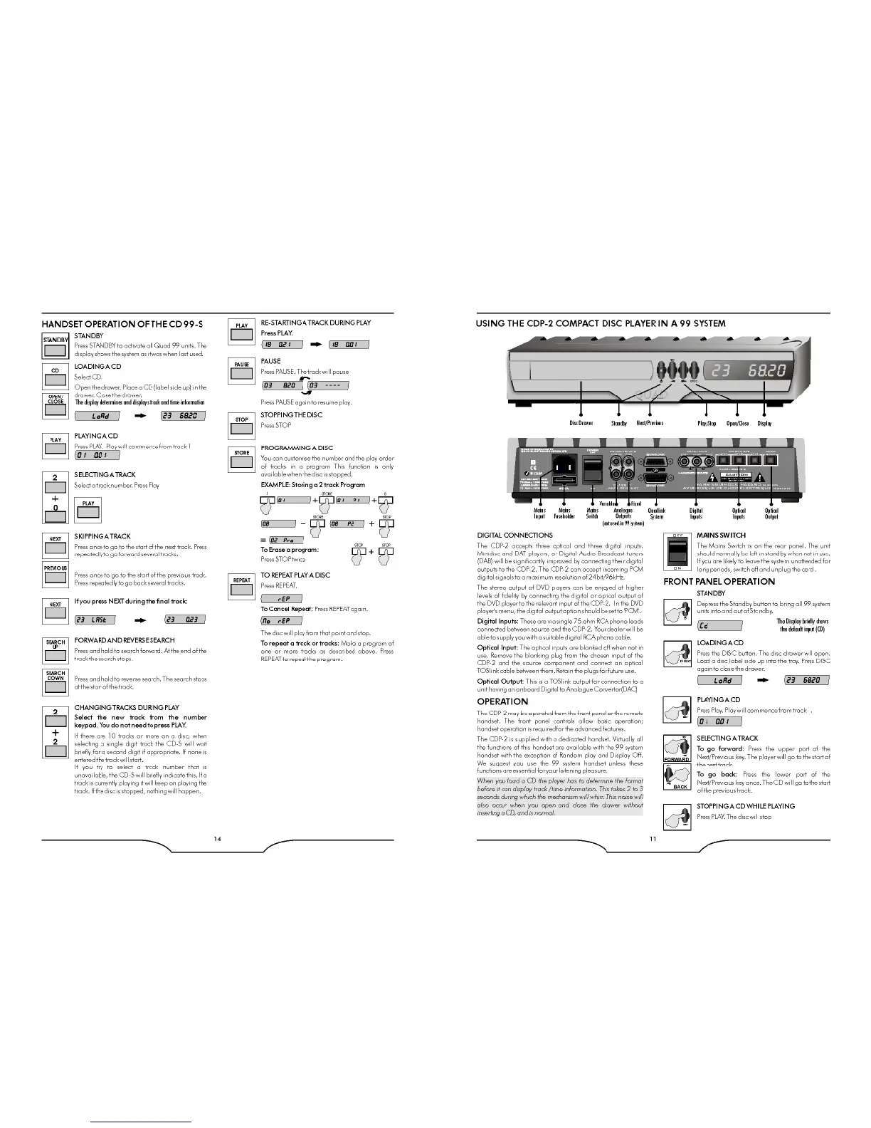 QUAD 99 PRE - CD Player Handset Operation; CD-S Handset Functions; CDP-2 Integration in 99 System