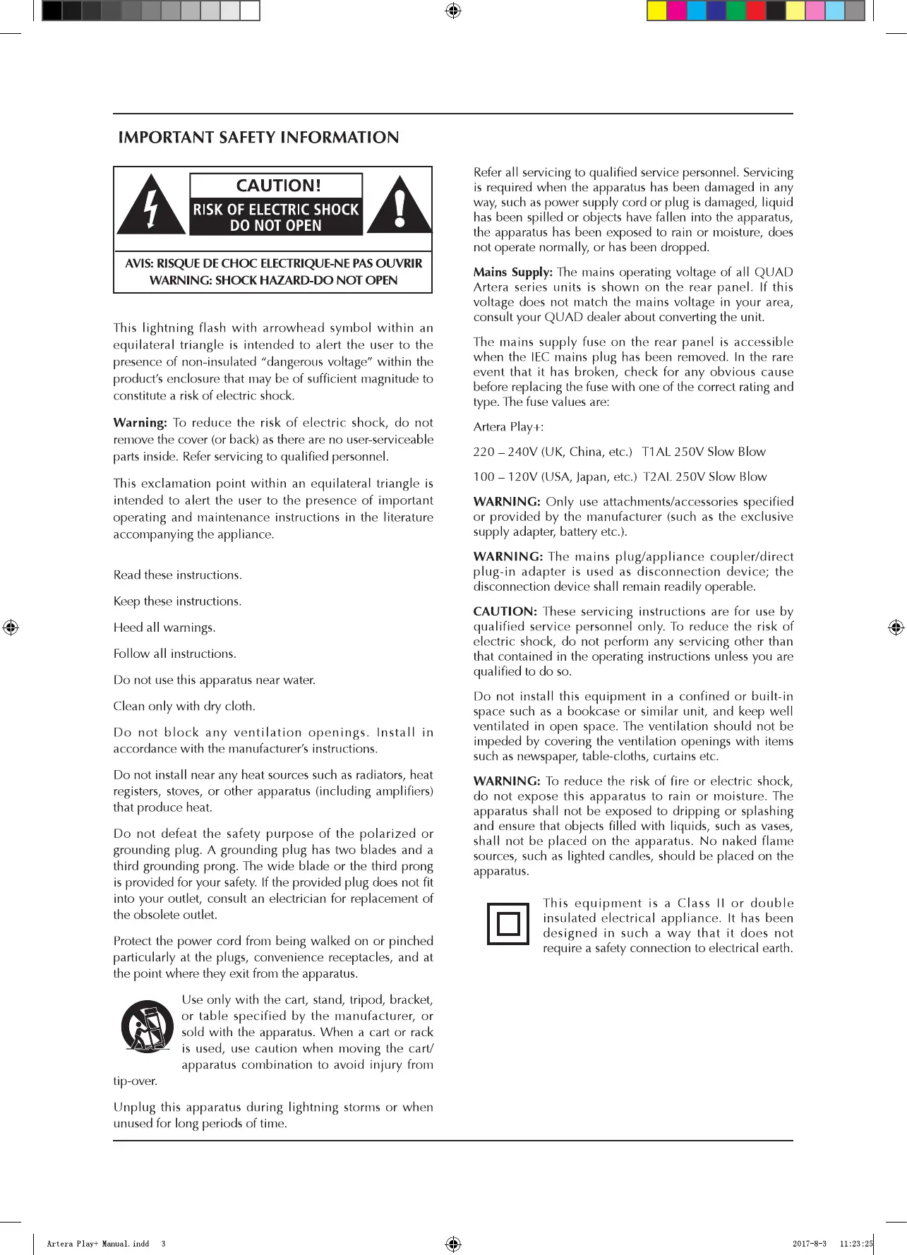 QUAD Artera Play+ - IMPORTANT SAFETY INFORMATION; General Electrical Safety; Usage and Environmental Precautions; Power Supply and Servicing