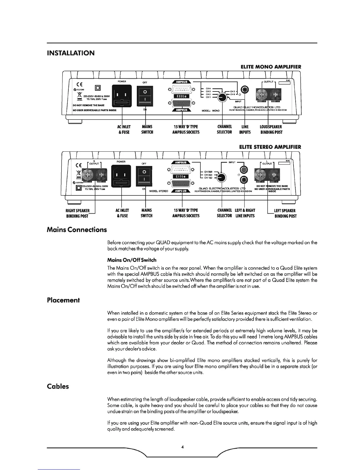 QUAD Elite Series - INSTALLATION; Mains Connections and Switch Operation
