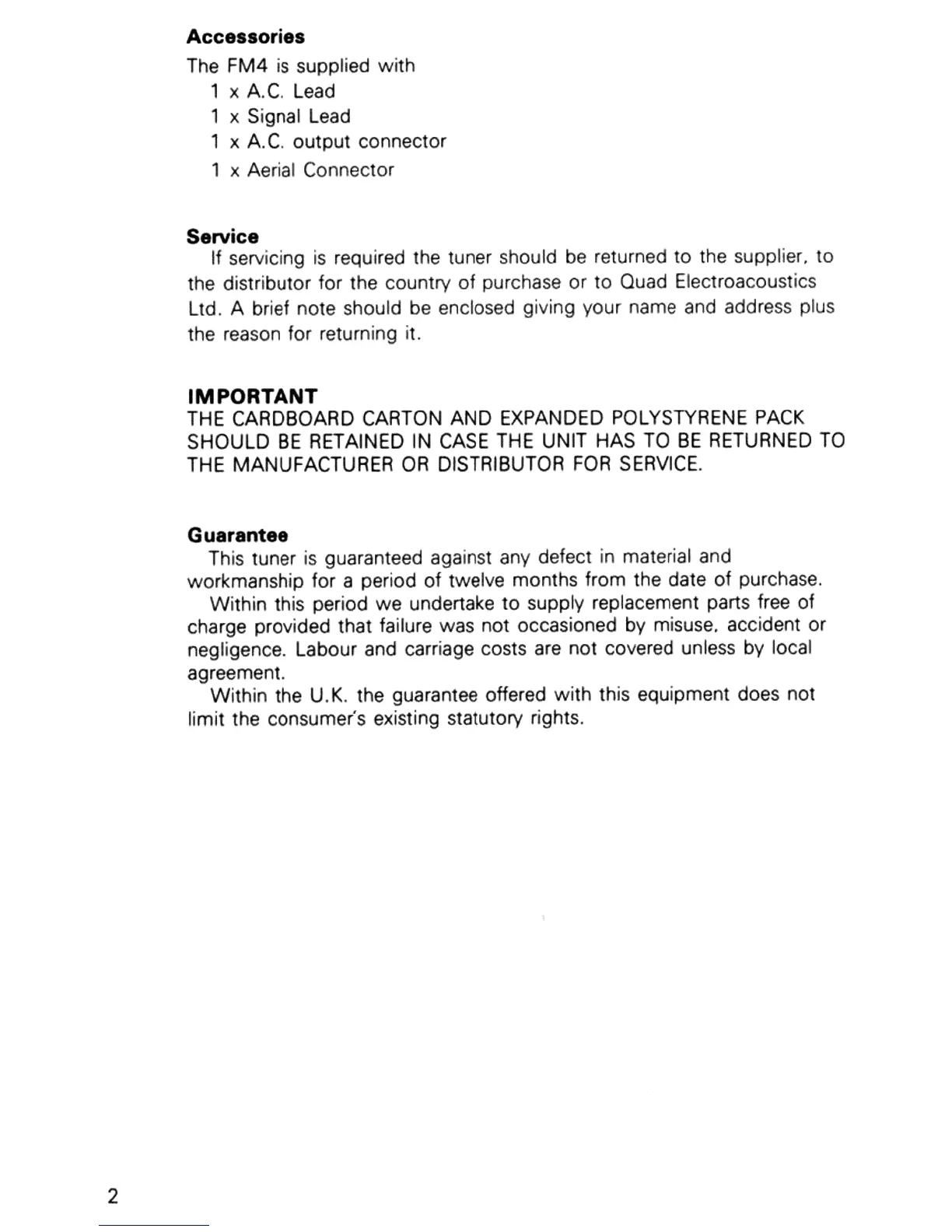 QUAD FM4 - Accessories Supplied with the FM4; Service and Packaging Advice; Important Packaging Note for Service Returns; Guarantee Information