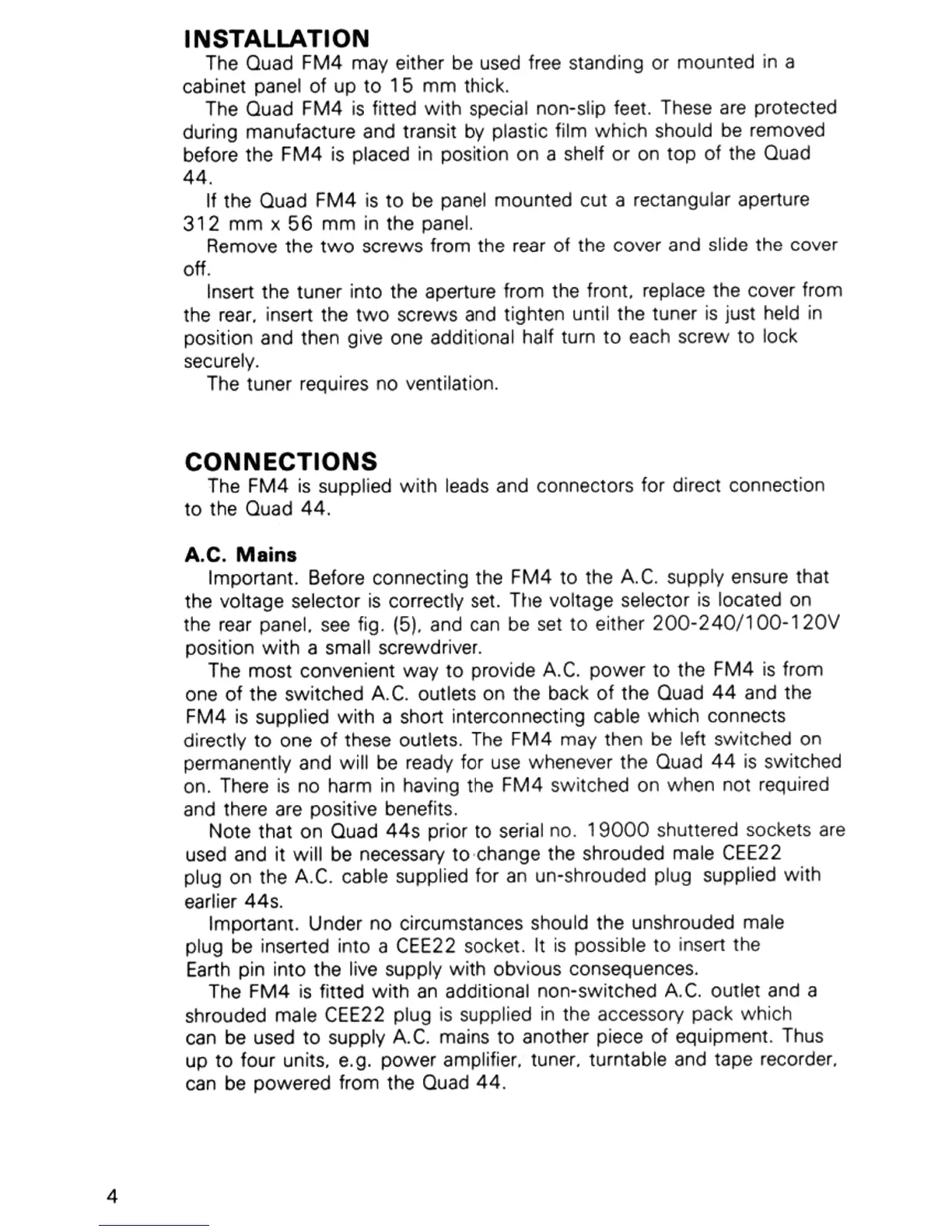 QUAD FM4 - Installation of the FM4; Connections and Power Supply; AC Mains Power Connection
