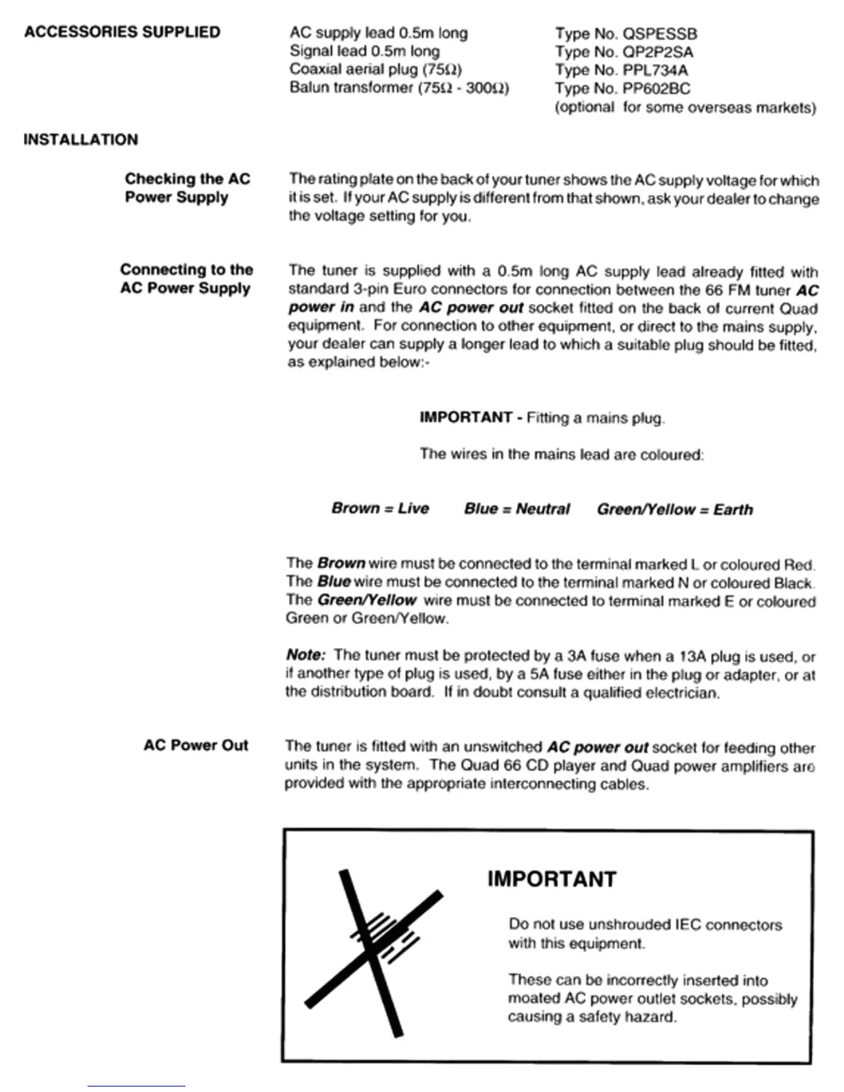 QUAD FM66 - Installation; Checking the AC Power Supply; Connecting to the AC Power Supply; AC Power Out