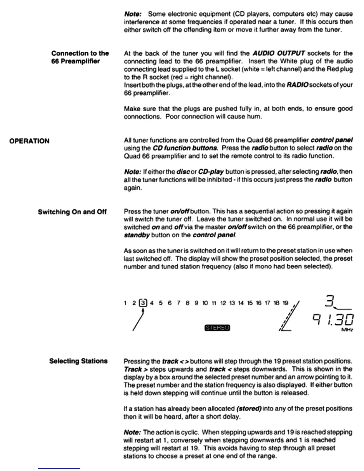 QUAD FM66 - Operation; Connection to the 66 Preamplifier; Switching On and Off; Selecting Stations