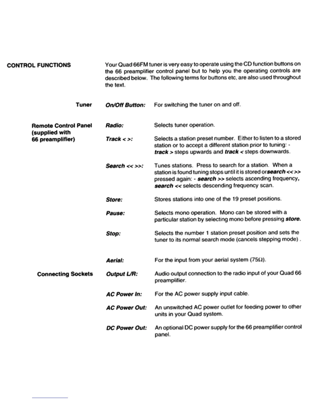 QUAD FM66 - Control Functions; Tuner; Remote Control Panel (supplied with 66 preamplifier); Connecting Sockets