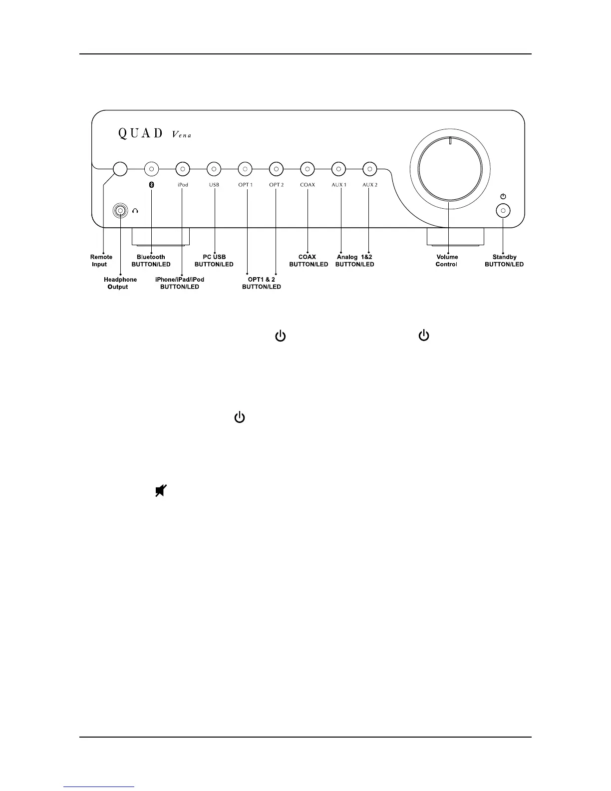 Vena will be in standby mode when powered on. The indicator on front panel is lit. Press button to bring Vena out of