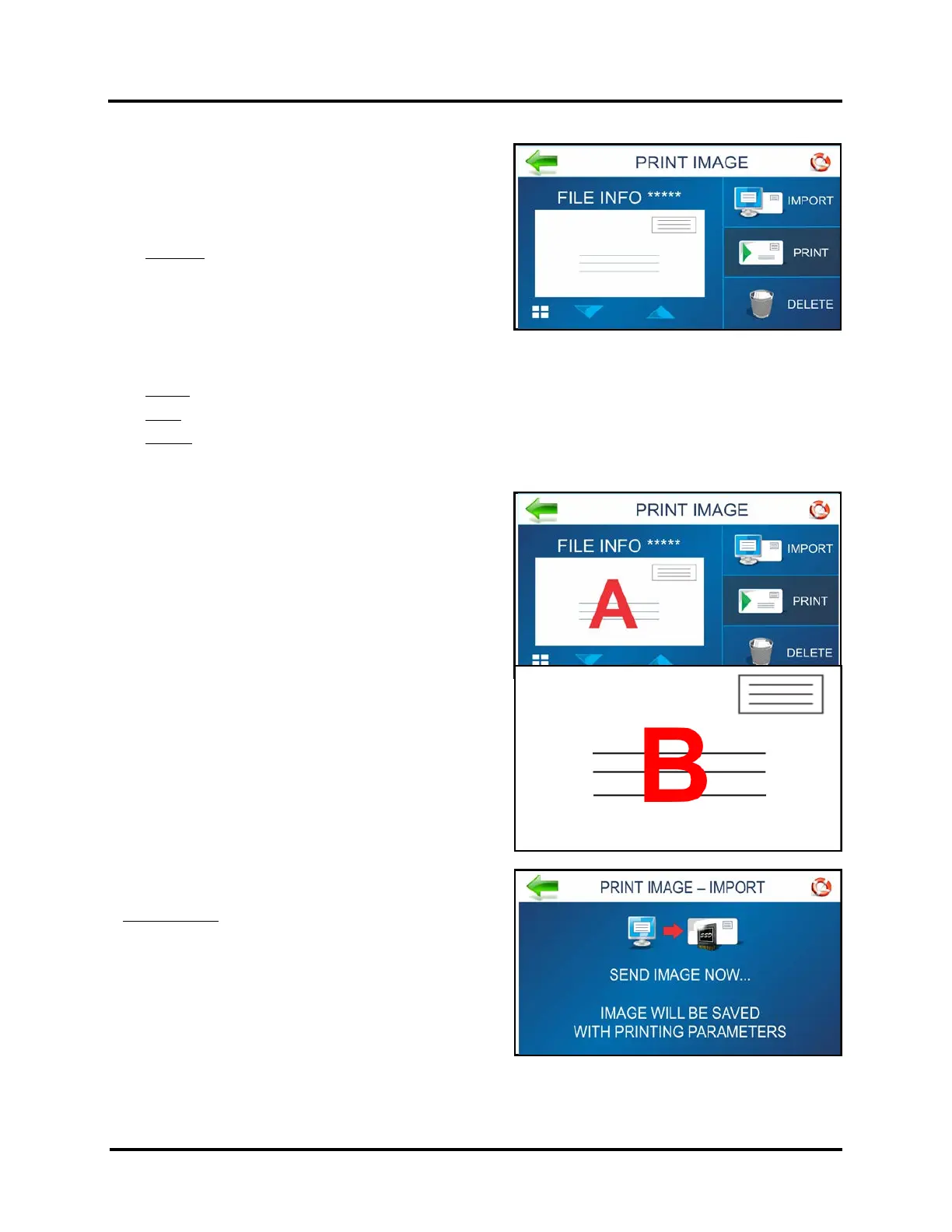 Import: Puts the Printer in mode to accept and store an image. See “Print Image – Import” for details.