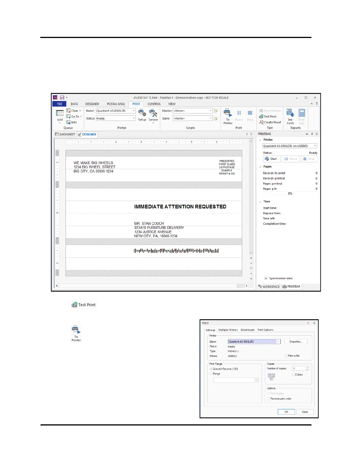 8. Click on (Test Print) button to immediately send the current record, in the Layout, to the Printer.
