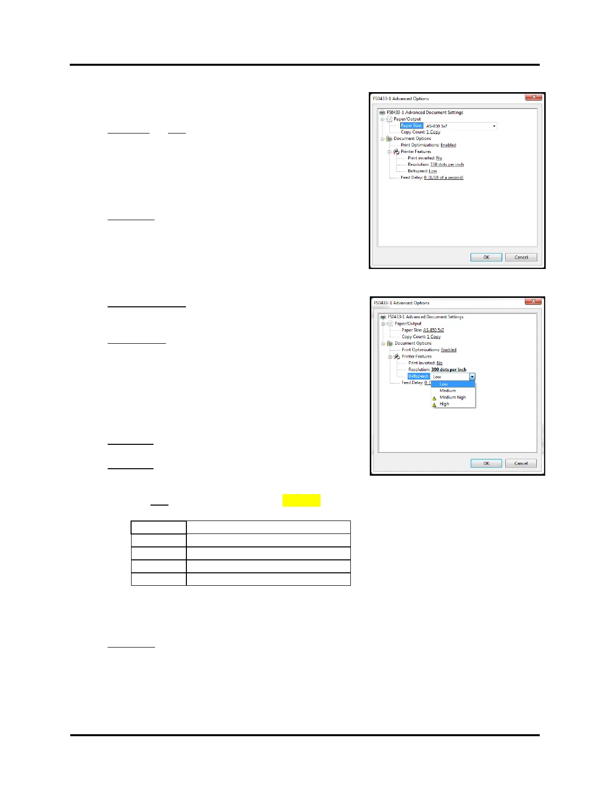 NOTE: Belt Speed selections are limited by the current Resolution selection.