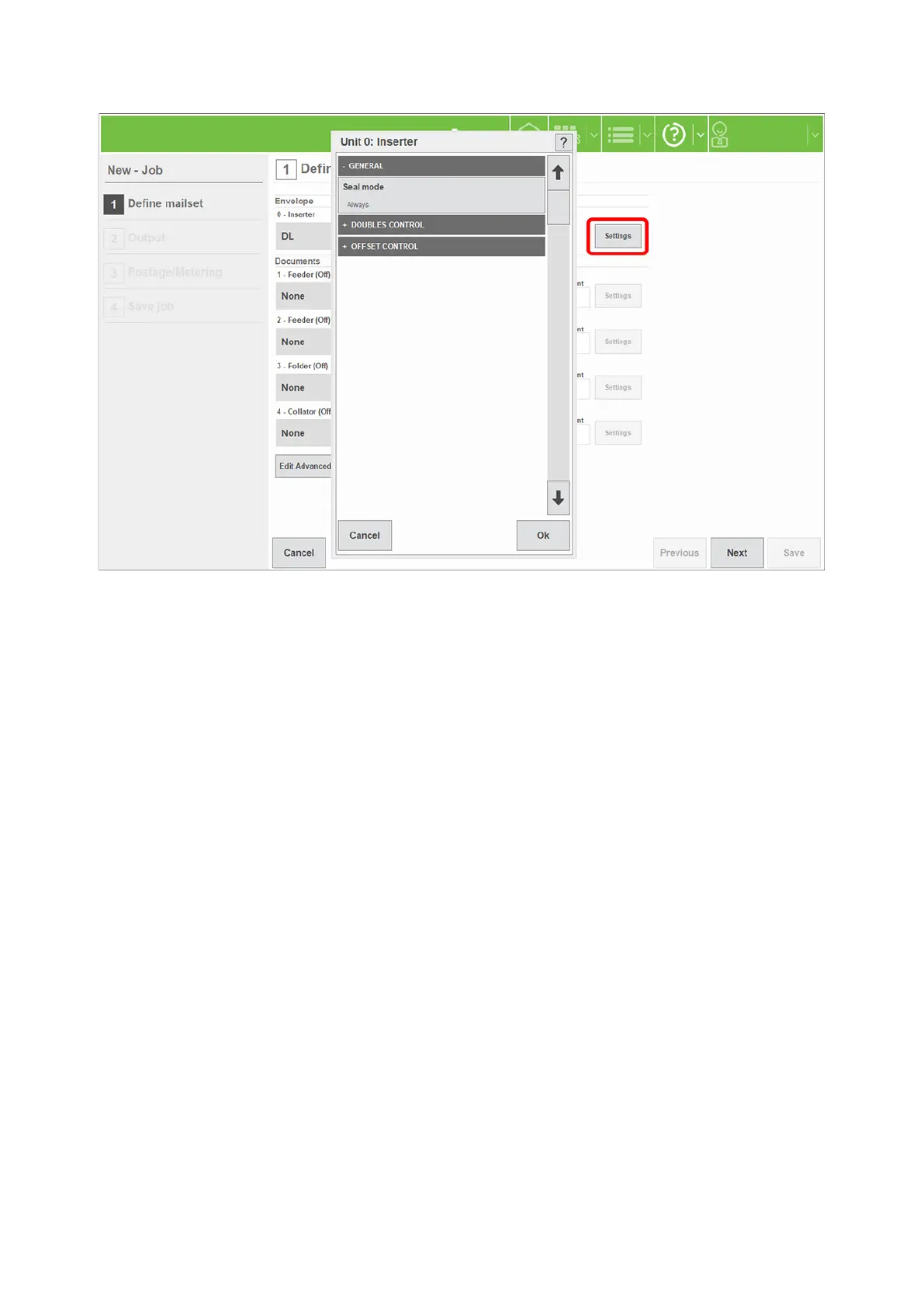 Feeder or Folder, applies to that unit only. For Inserter, applies to all units at