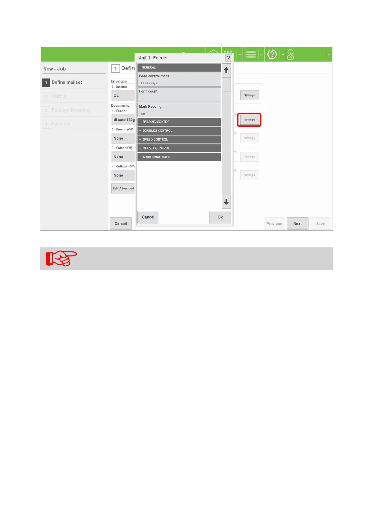 Settings for a Feeder, Folder or Collator Unit are described below: