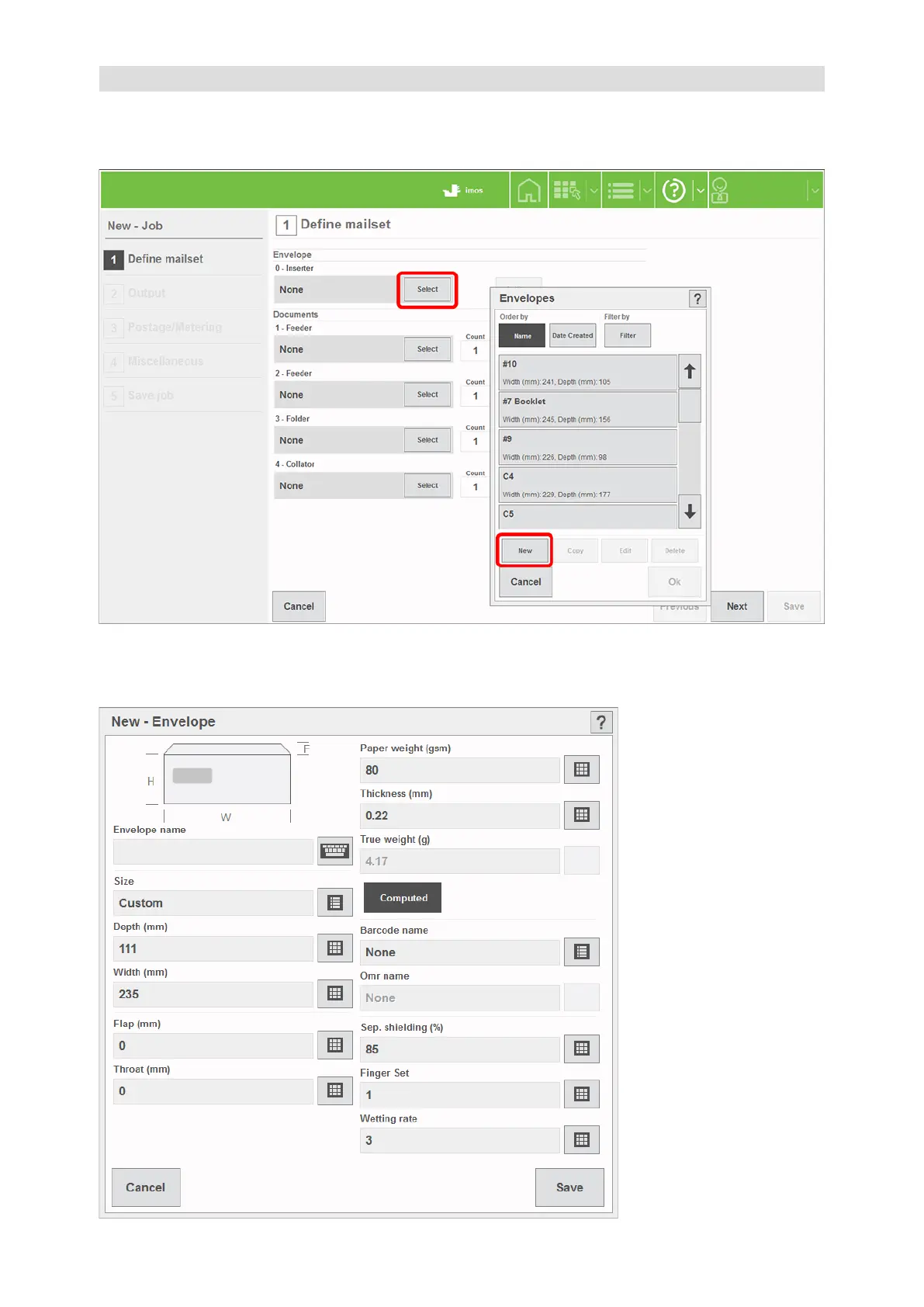 1 Begin creating a job (see section 7 Creating a job) and select an envelope.