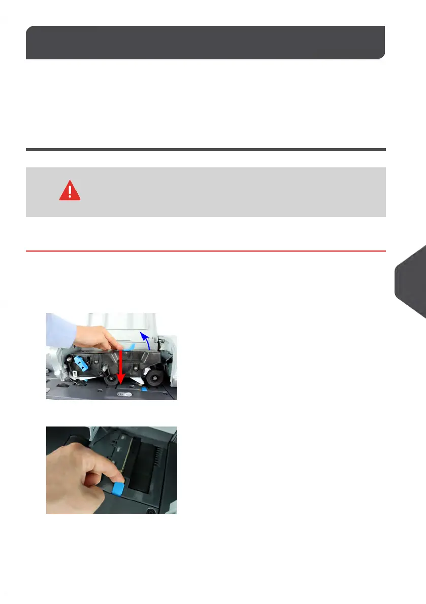 1. Open the feeder and push the left of the upper blue release lever to raise the upper