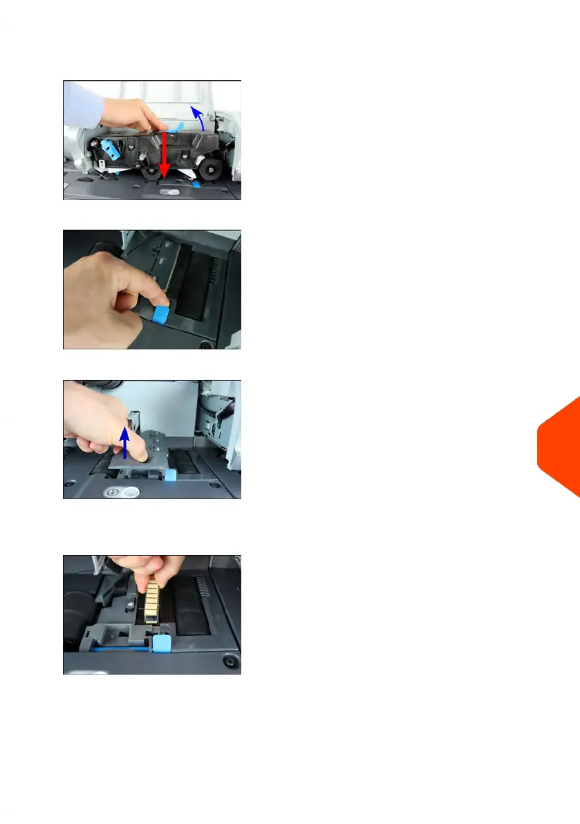 1. Open the feeder and push the left of the upper blue release lever to raise the upper