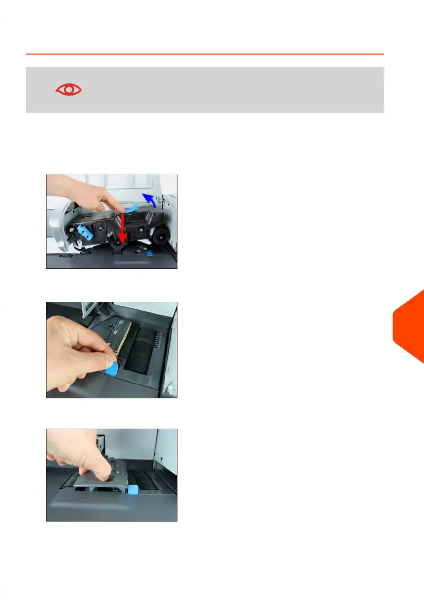 1. Open the feeder and push the left of the upper blue release lever to raise the upper