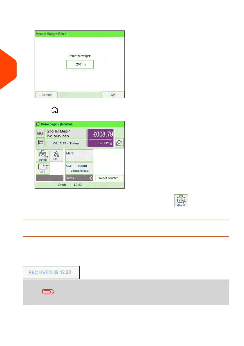 The home screen displays the Manual Weight Entry icon ( ) and the weight