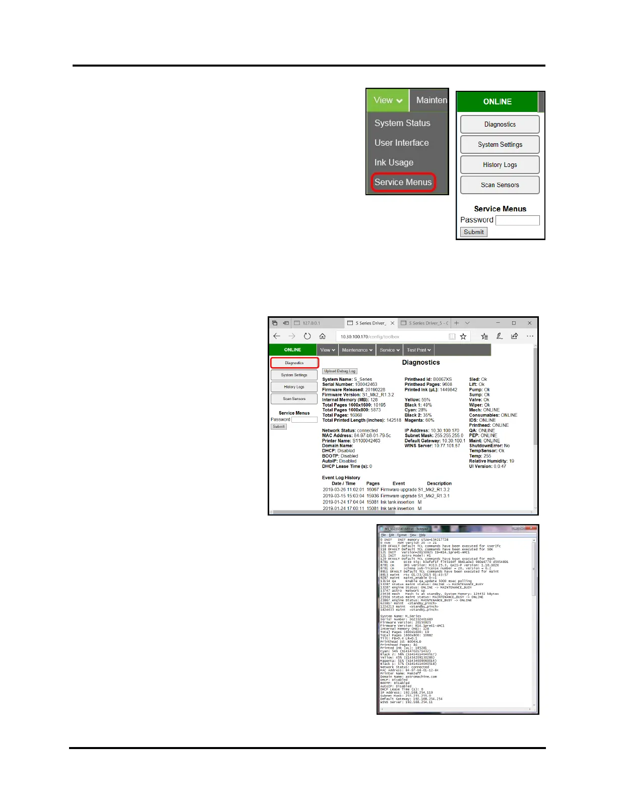Clicking Service Menus opens the Service Menus (Diagnostics)