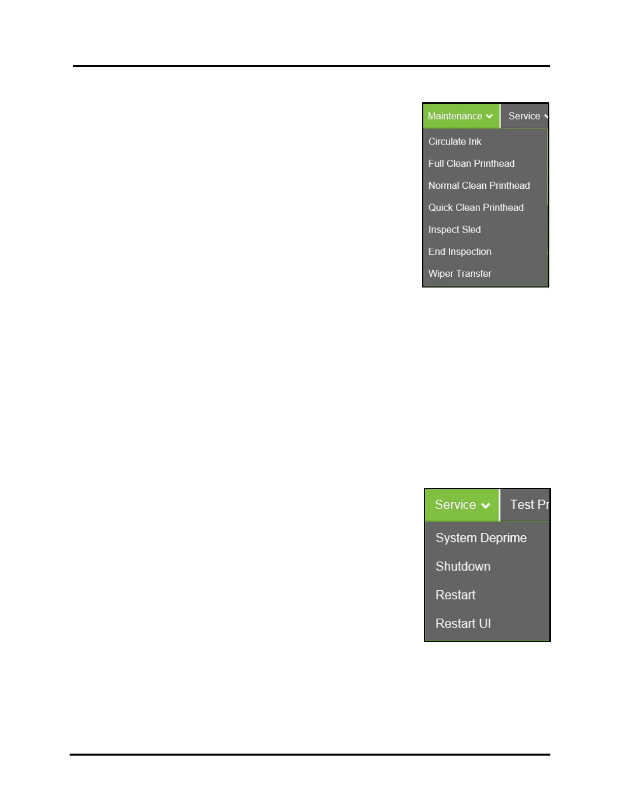 Restart UI – Shuts-down and restarts the Printer’s Touchscreen Display without perform any Print Engine