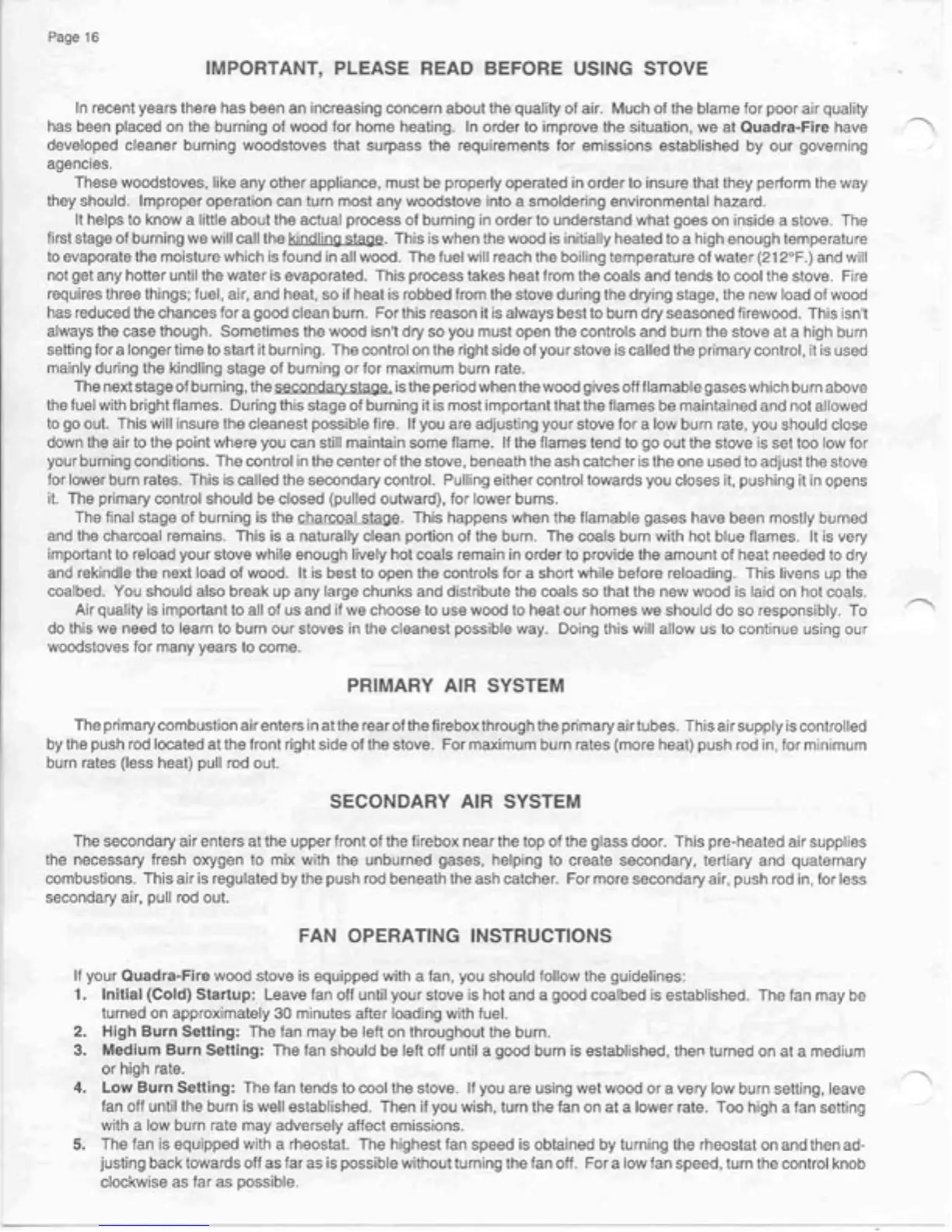 Quadra-Fire 2100 - Primary Air System; Secondary Air System; Fan Operating Instructions