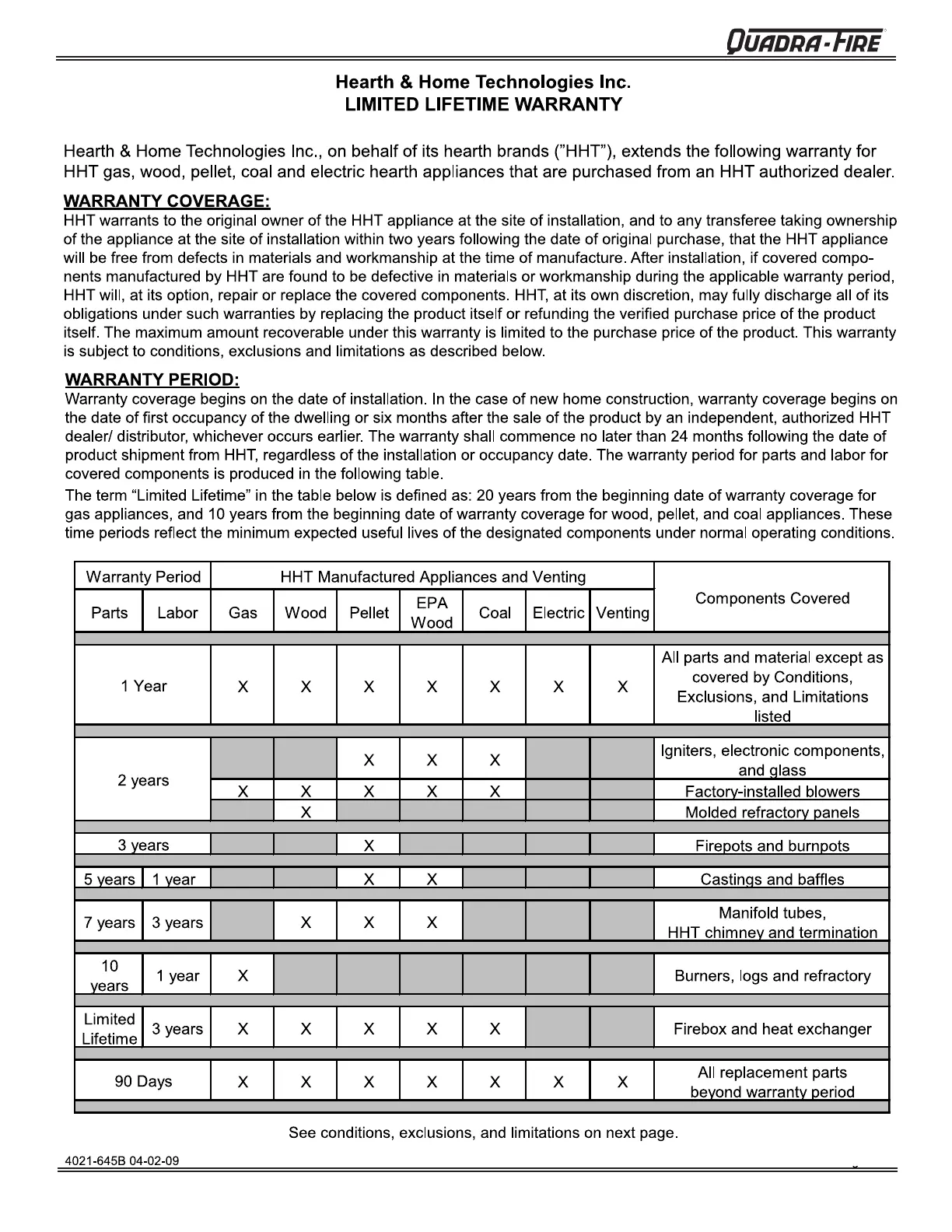 Quadra-Fire CASTILE - Limited Warranty