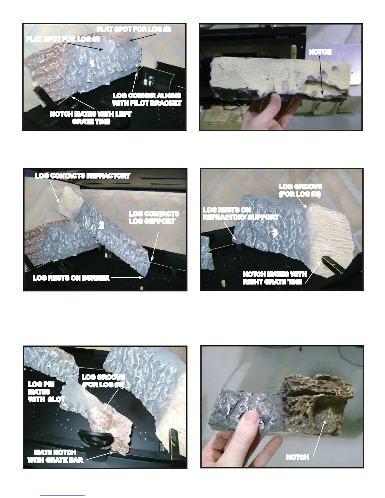 Log #3 (SRV2227-701): Mate the notch with the right grate tine as shown in Fig 9. The back of the log should rest on the