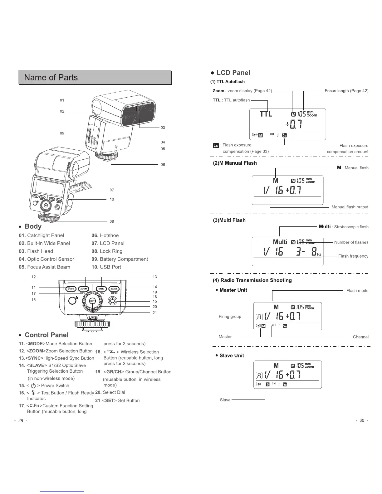Quadralite Stroboss 36 C - Name of Parts; Body; Control Panel; LCD Panel