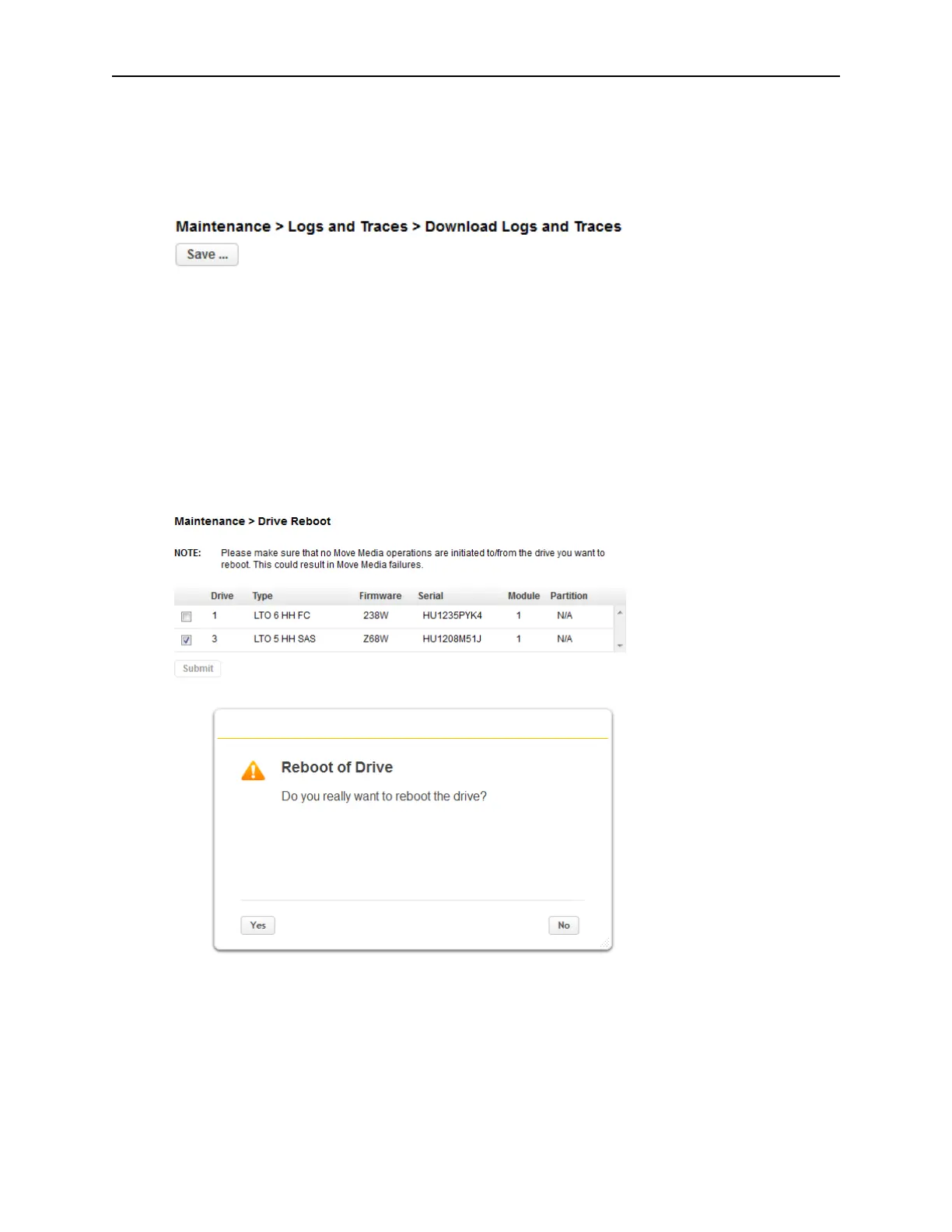 To reboot a tape drive, navigate to Maintenance > Drive Reboot. Select the desired tape drive and click