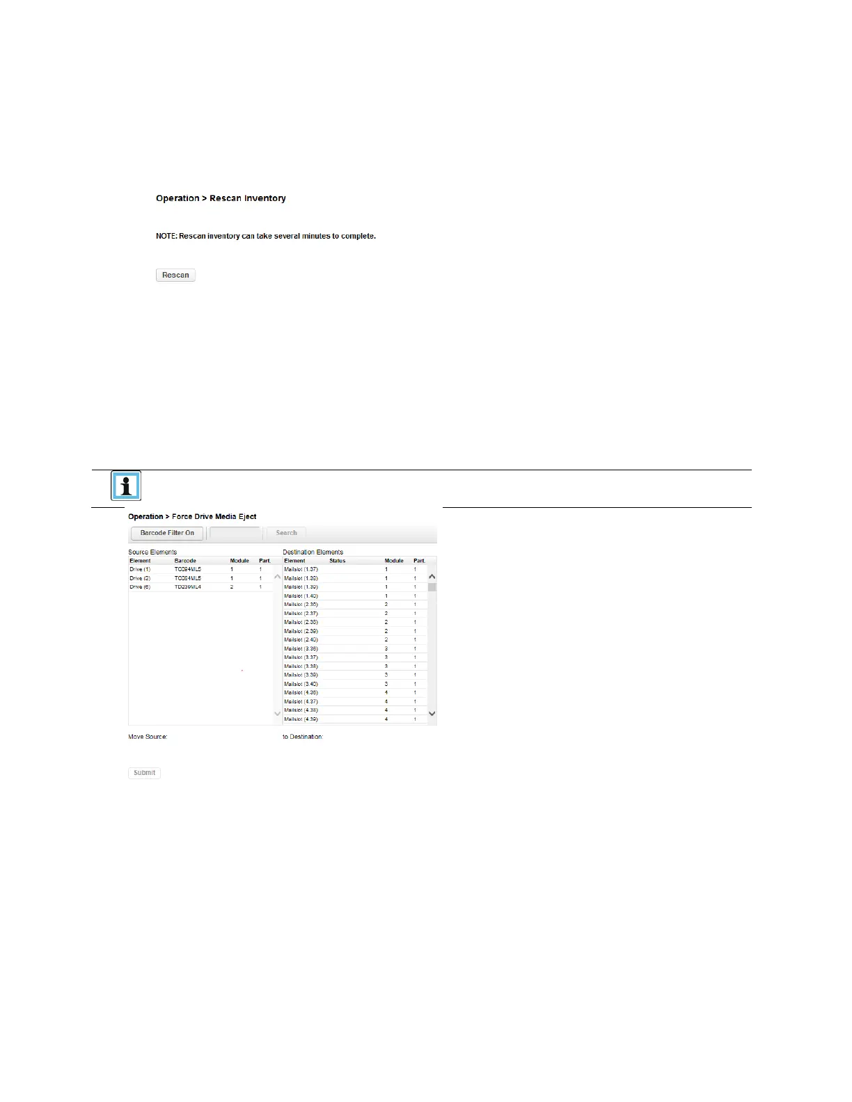 To have the library rescan the cartridges, navigate to the Operation > Rescan page and click Rescan.
