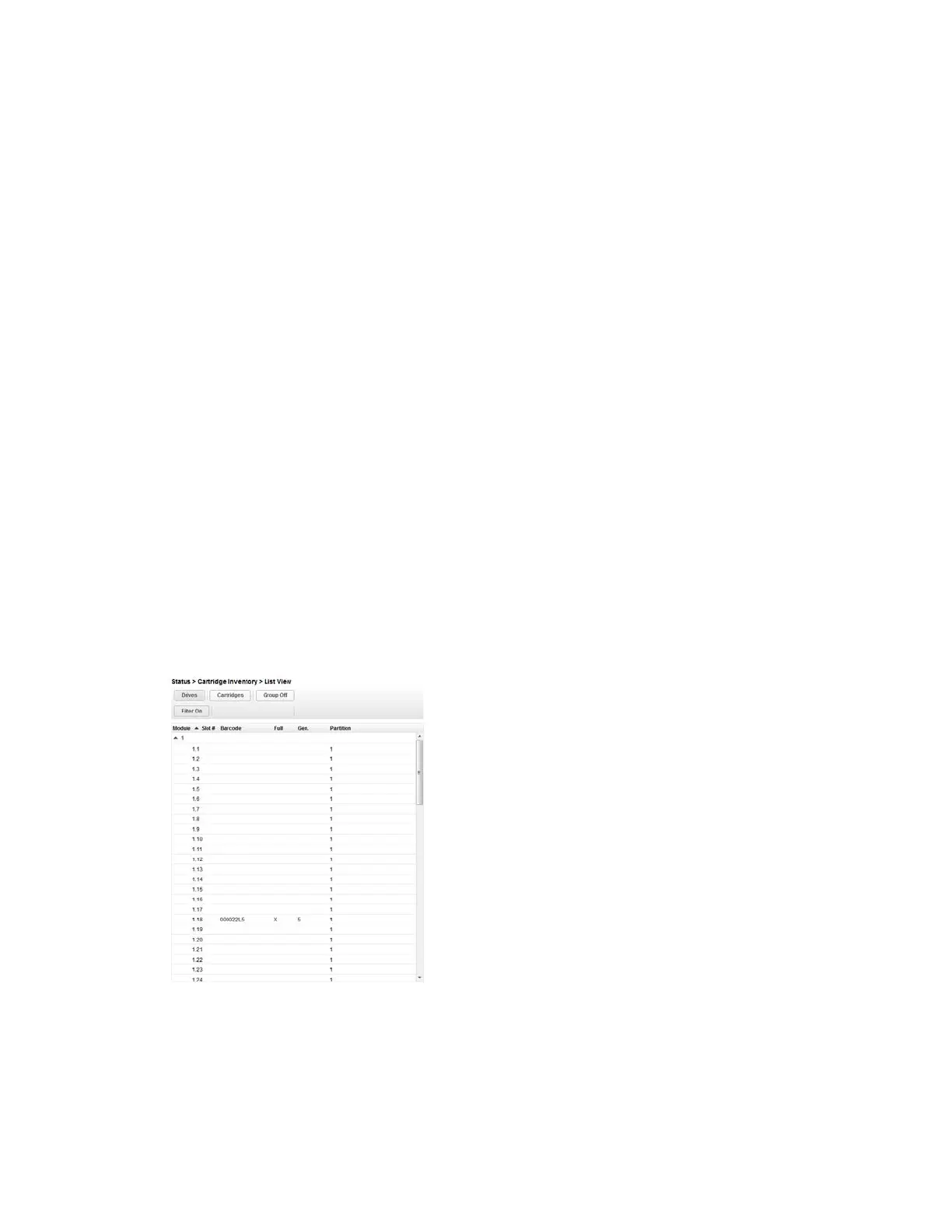 To see the library’s current inventory information, navigate to Status > Cartridge Inventory.