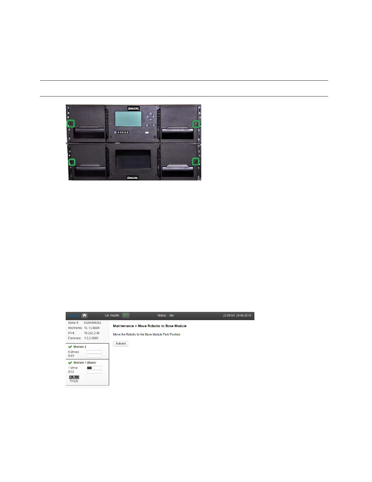 • From the RMI, navigate to the Maintenance > Move Robotic to Base Module page. Select th