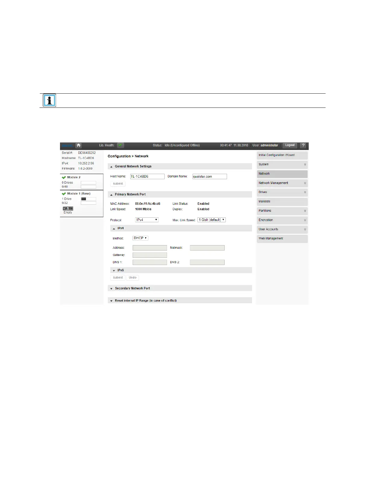 Use the Configuration > Network page to configure the library network settings.