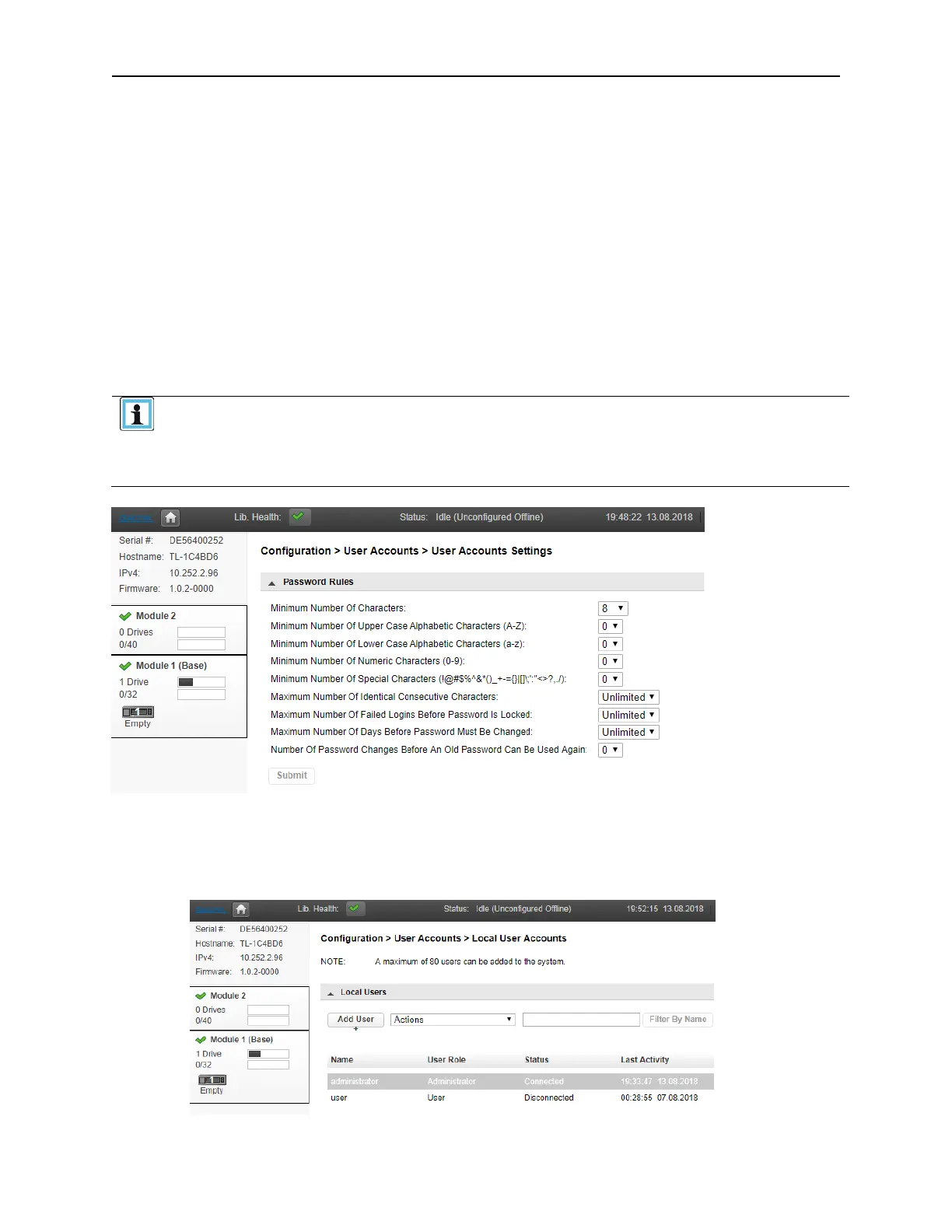 Use the Configuration > User Accounts page to configure the password settings for the library. There