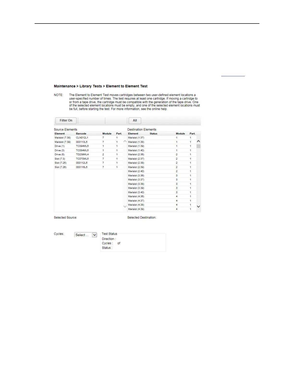 The element to element test moves a selected cartridge to a selected slot or tape drive, and then returns
