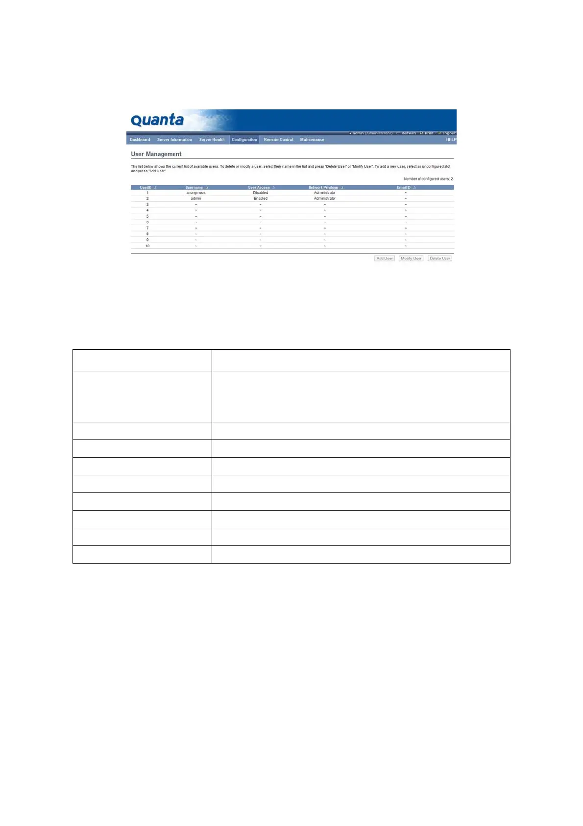 The fields of User Management Page are explained below.