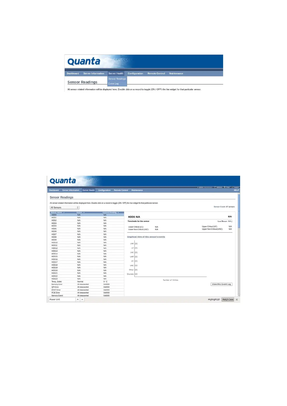 The Server Health screenshot allows to select Sensor Readings or Event Log as shown in
