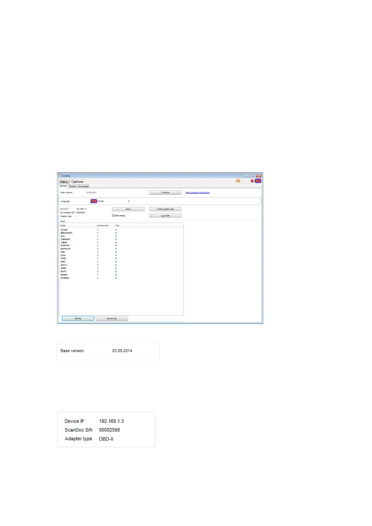 the scanner connected (the serial number, type, IP-address, database version, etc.),