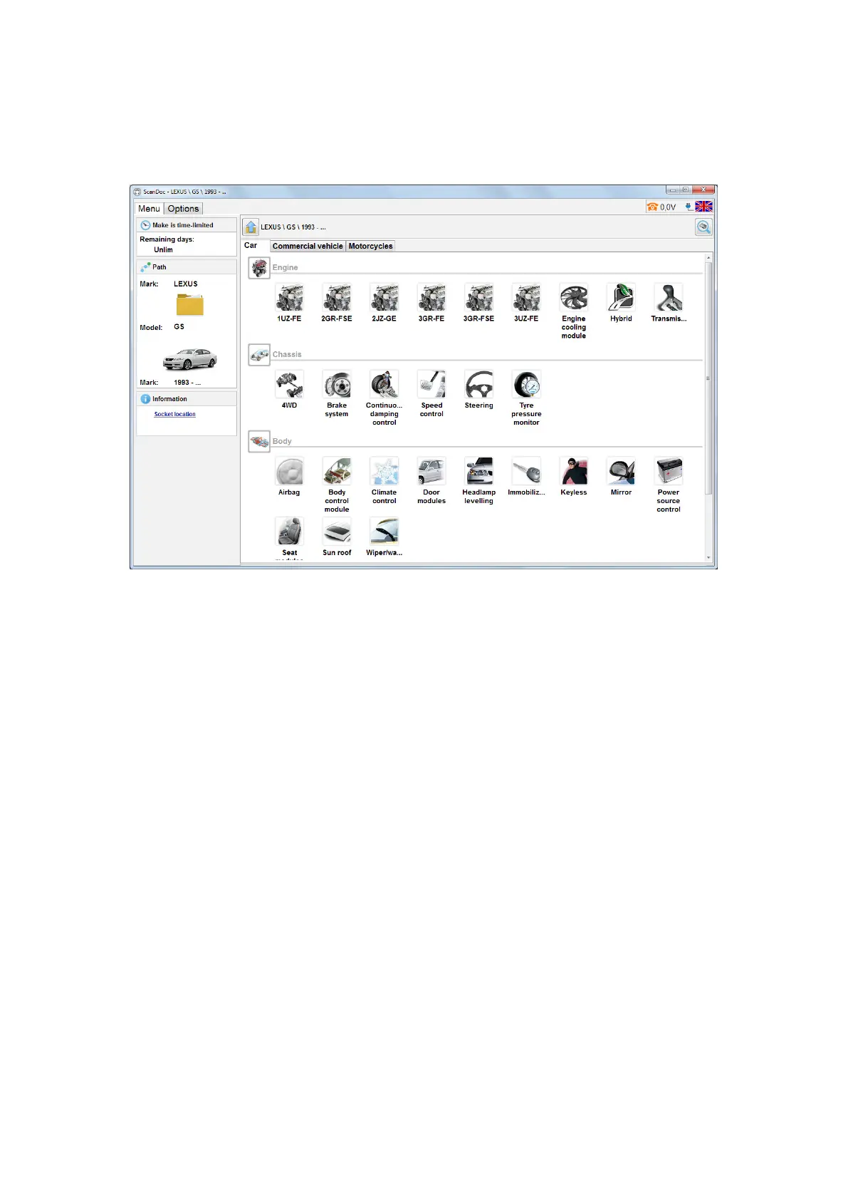 To start the work, one should select the car and the system to work with. All the