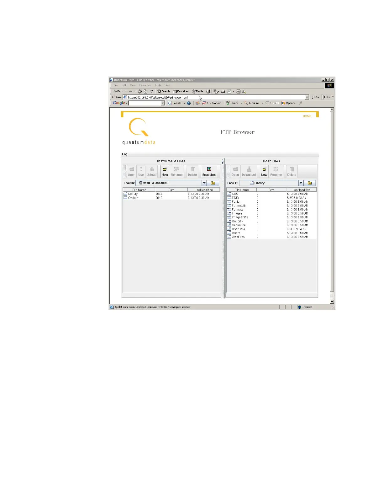 web page. The 882 FTP Browser appears. The Instrument Files area shows the files