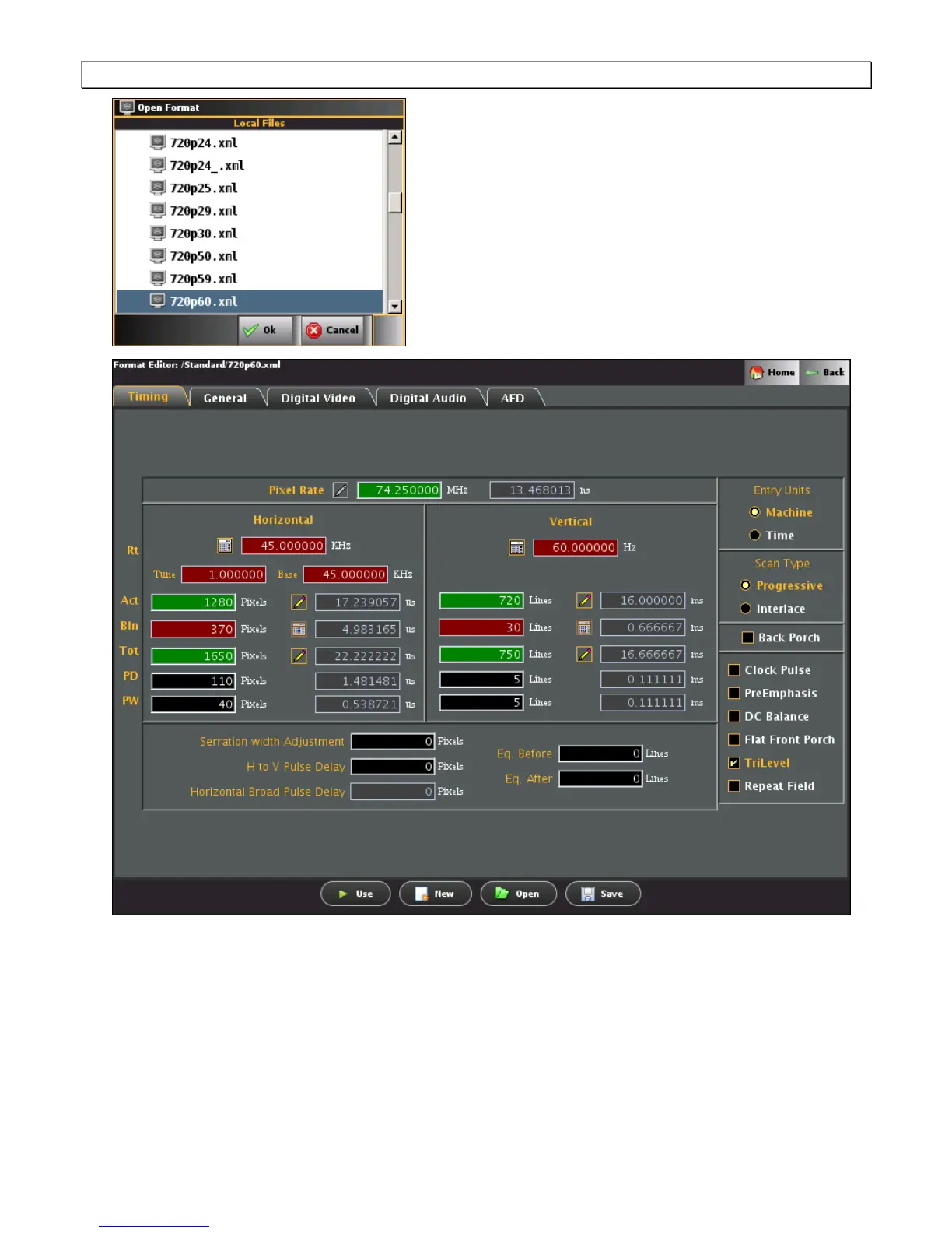 The format parameters of the selected format will appear in the new format Timing window as shown below.