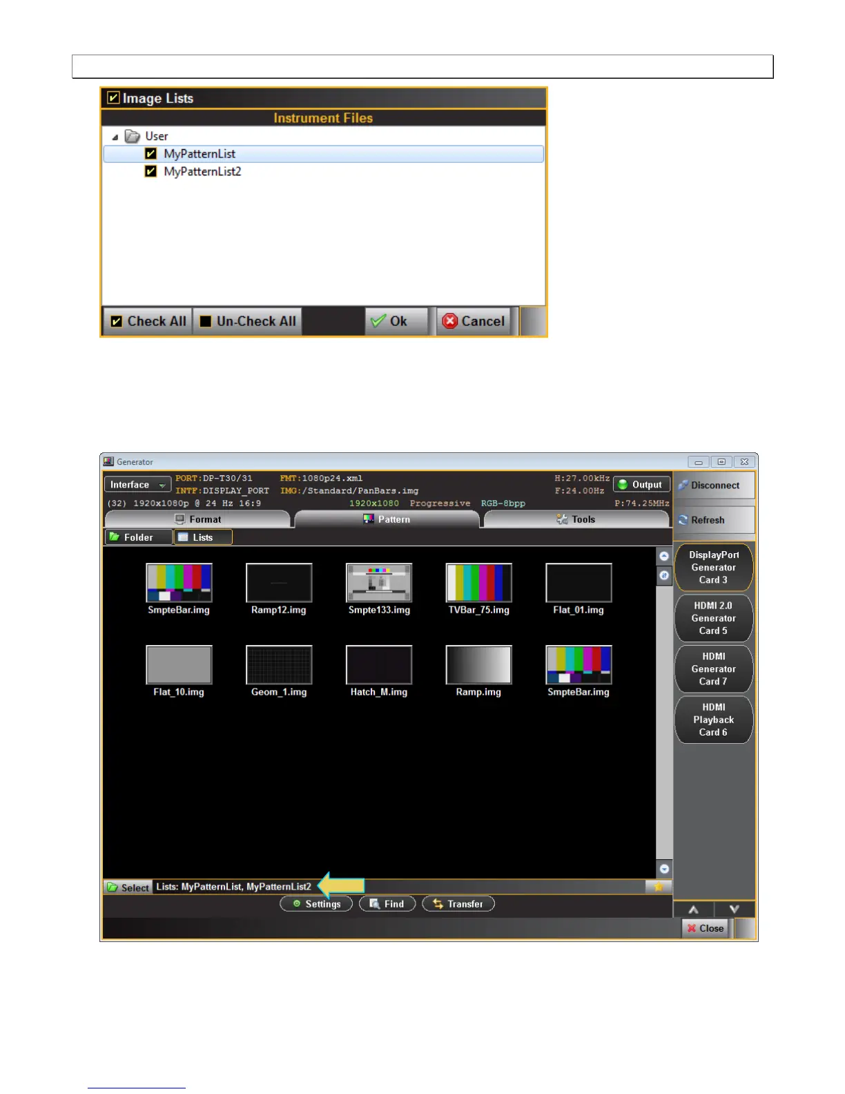 shows selecting one Pattern List. The Check All and Un-Check All activation buttons allow convenient