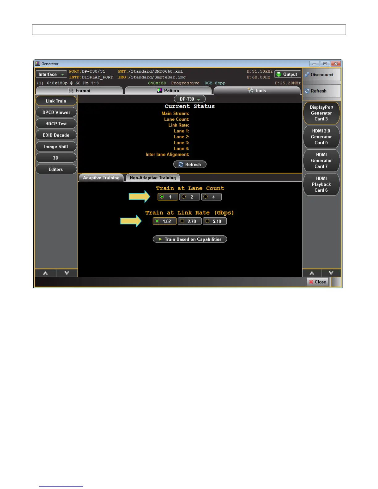 4. Select the Train at Lane Count and Train at Link Rate parameters using the radio buttons provided (1 lane