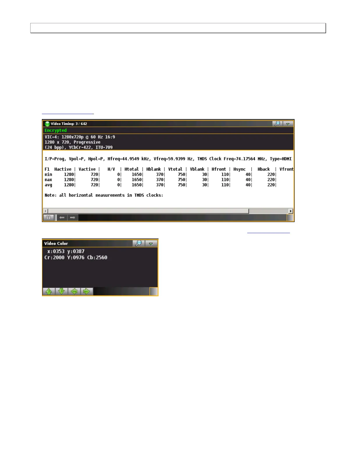 3. Select the Video Timing panel to view the video characteristics, timing and metadata. Refer to the section