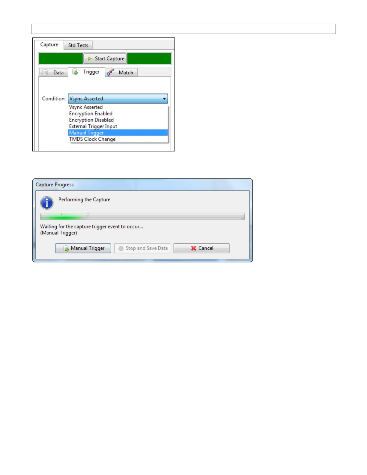 Typically manual triggers are used in the Pass-through or Encrypted Link Analyzer mode. In these modes there is
