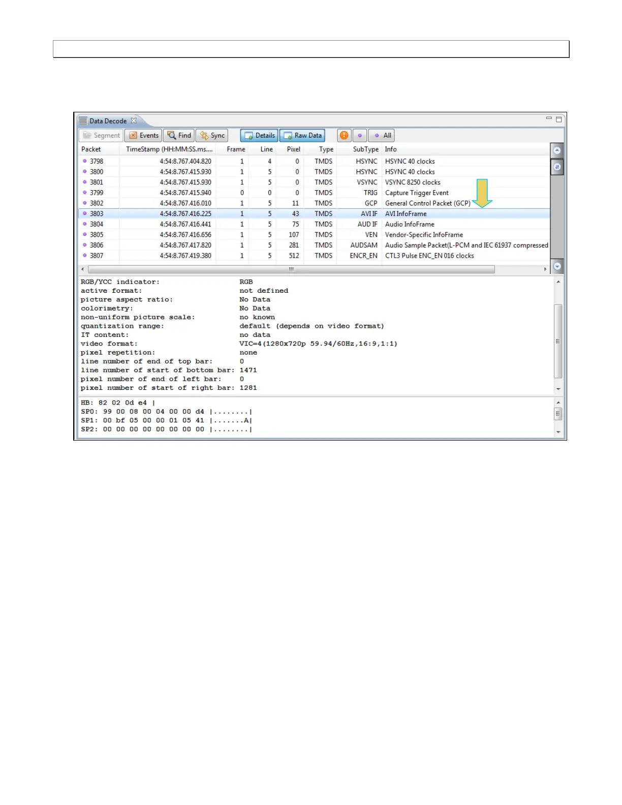2. Highlight an AVI infoframe record to view its contents as shown below. The Data Decode window above
