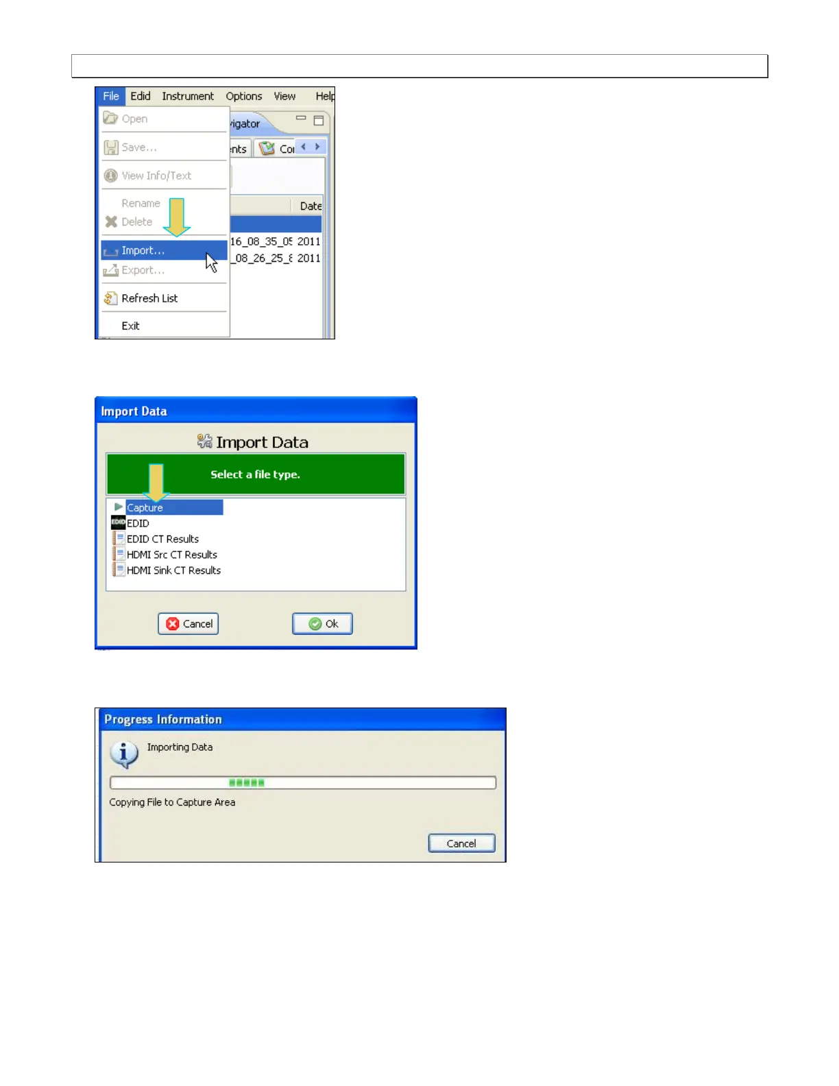 2. Select Import. A dialog box will appear enabling you to select which data type (EDID, Capture, etc) you want