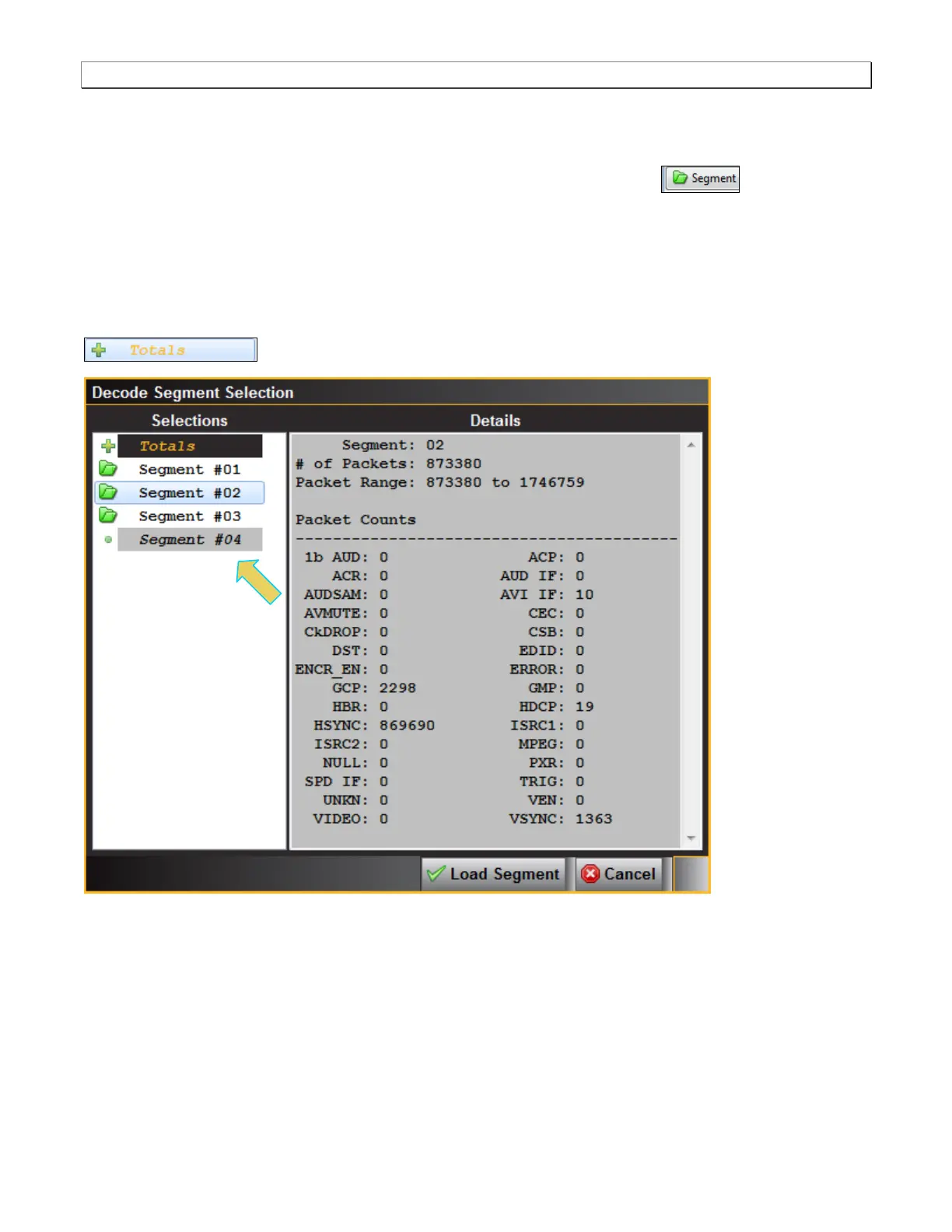 the Load Segment activation button on the bottom right. You can also select any segment to view its packet