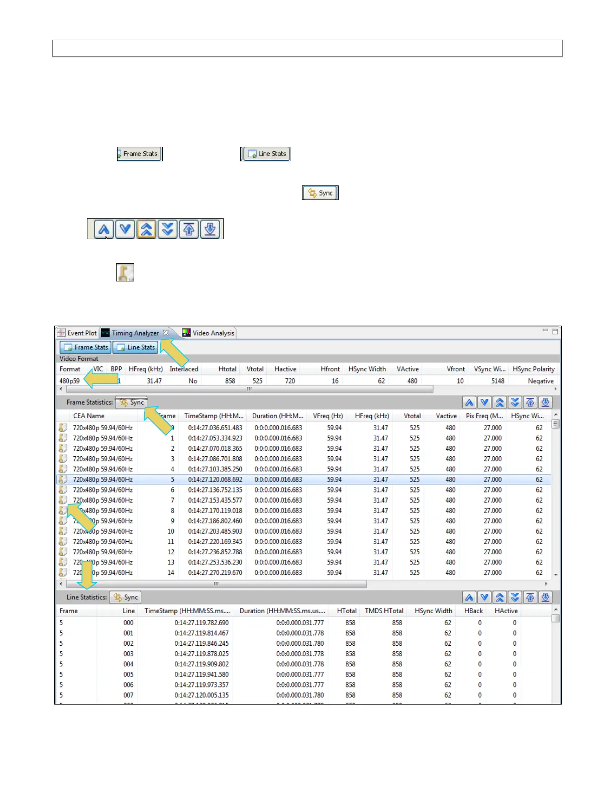The Timing Analysis panel provides timing information about a particular frame and line or for all frames and lines.