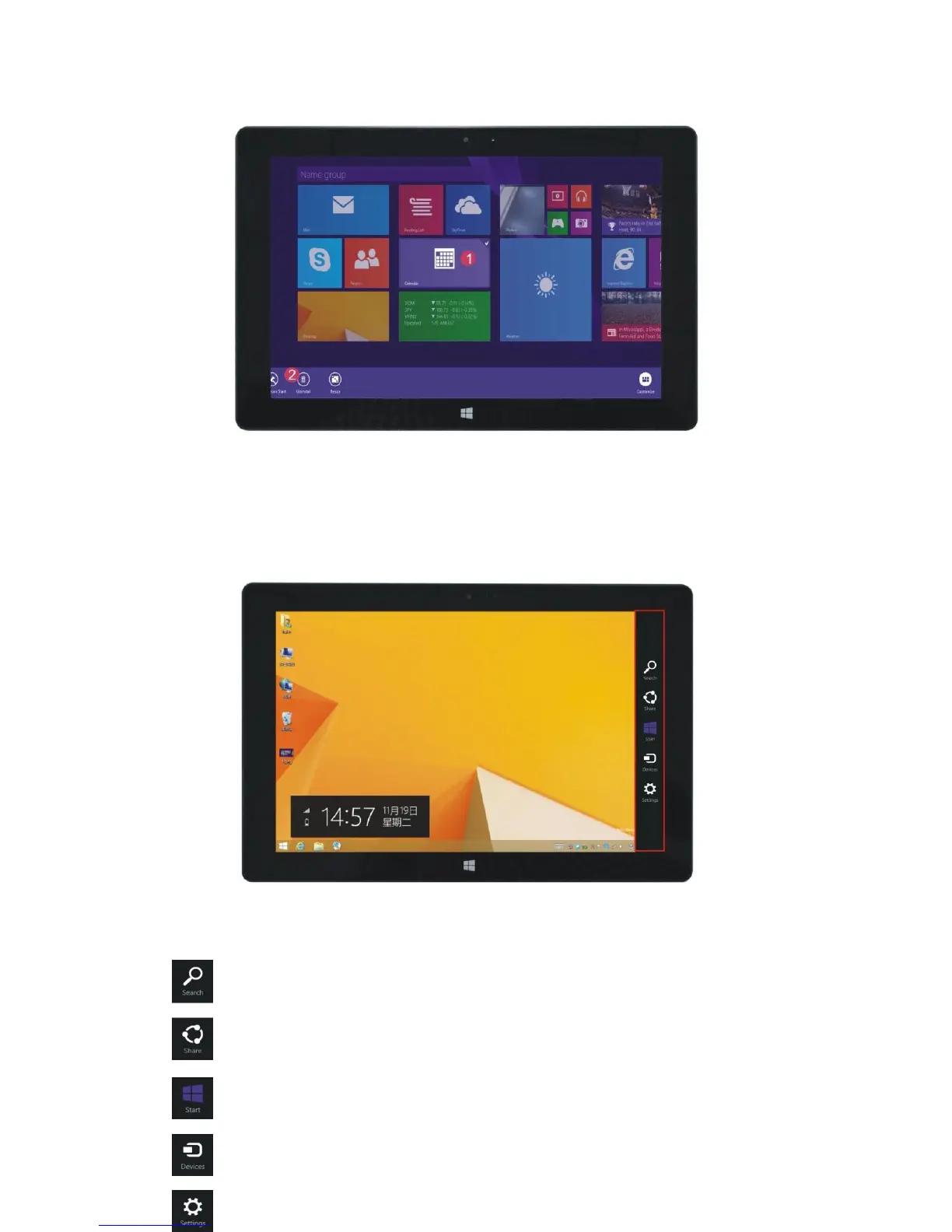 Slide to the left from the right side of the screen to open the menu column, including: Start,